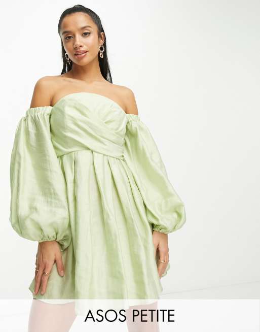 ASOS DESIGN Petite washed off shoulder balloon slv mini dress with wrap corset detail in sage green Very well made.