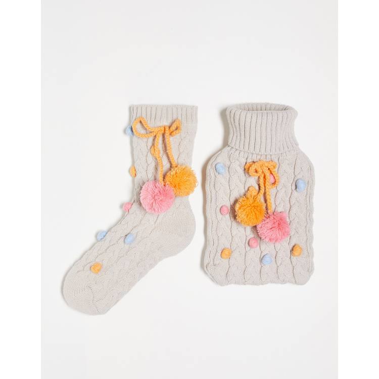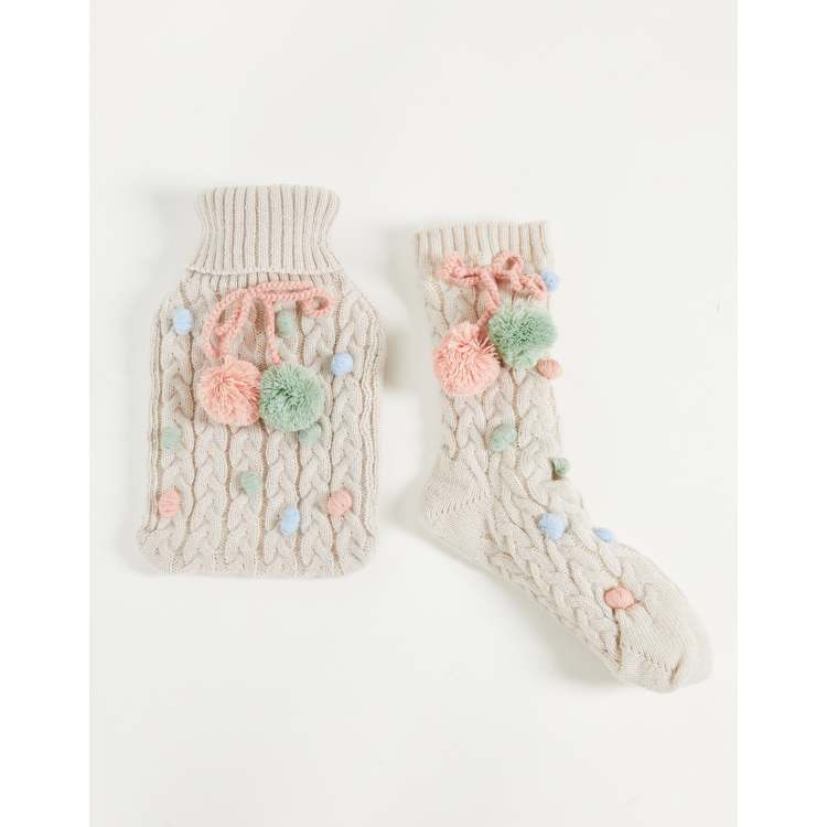 ASOS DESIGN pom pom cable knit hot water bottle and socks in oatmeal Very well made.